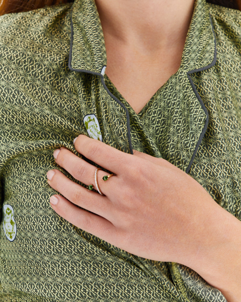 The crisscross rings made by the Nanis artisans are born from sinuous lines in 18kt gold and a delicate pavé of diamonds which give life to extremely refined jewels. Our designers, over time and with the changing trends, have designed this ring in different versions: with precious gems of aquamarine, London Blue topaz, lively tourmalines, black onyx and, finally, with the iconic hand-engraved boules.