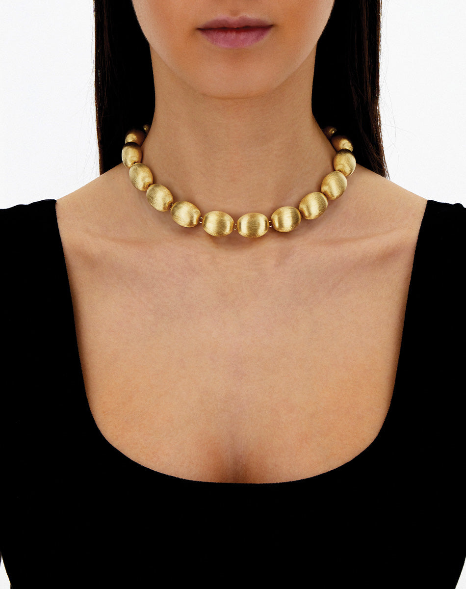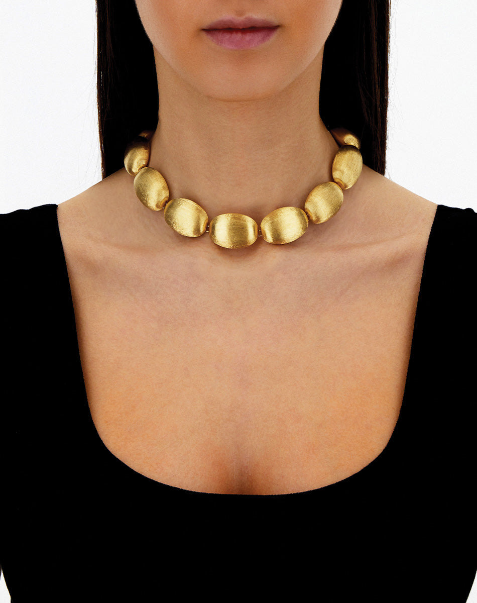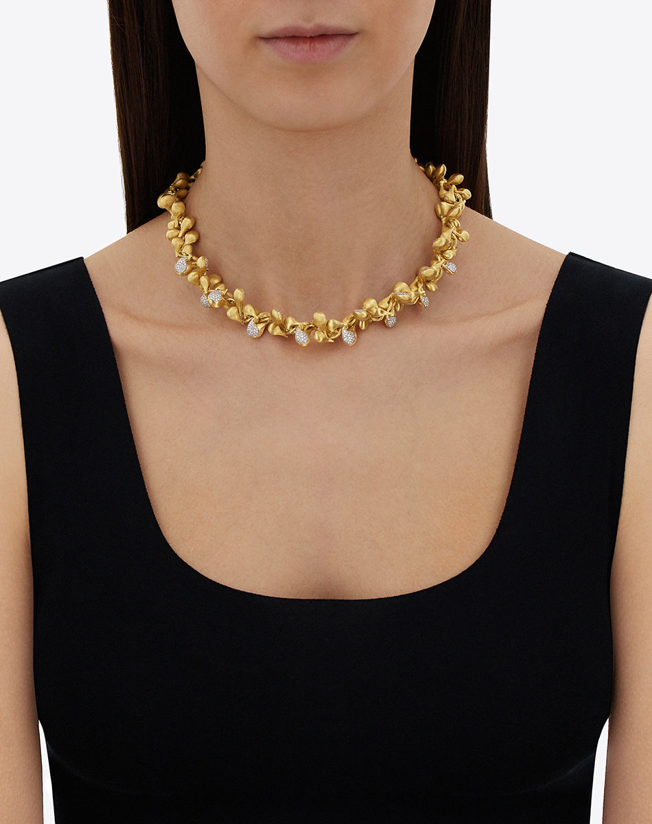 From the iconic IVY, our 18kt gold beads and diamonds necklace, extremely versatile and available in many sizes, which can be interpreted as chanel, lariat or as a choker; or the necklaces of the LIBERA collection, "un-chained" and very elegant chains, or the necklaces of the TRASFORMISTA collection that, with a simple touch, change their shape! And again, models in beautiful natural stones, such as aquamarine or black onyx.