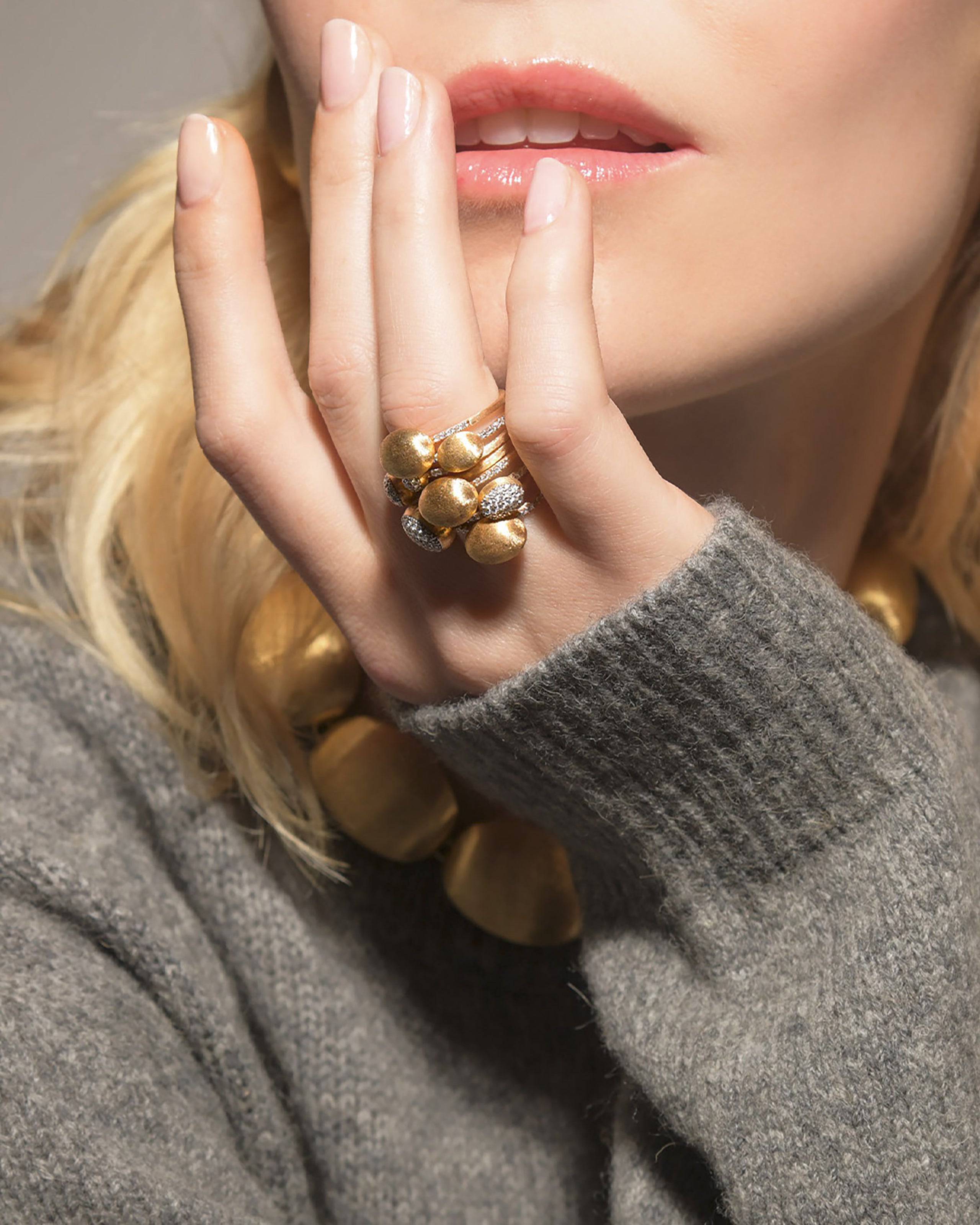 Be won over by the spring-like lightness of these 18kt gold rings. From youthful and eternal diamond engagement rings, to yellow gold rings and gemstones to uniquely styled double or triple bands that are perfect for marking your unforgettable occasions in time, be they majestic weddings or anniversaries or just occasions to seal with a precious gift.