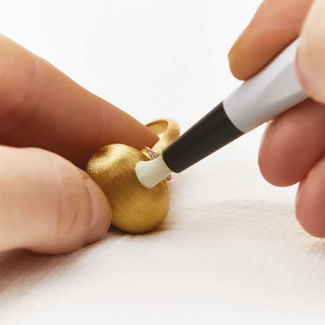 Given the depth of the micro-grooves, dust can easily settle on the hand-engraved texture of the jewel. Furthermore, creams and cosmetics could dull the jewel and its stones.