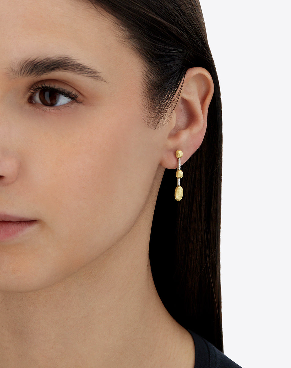 Elegant 18kt boules, hand-engraved with artisanal wisdom, chase each other along sparkling diamonds in these contemporary earrings. Laura, who tests each of her creations, has then created special butterflies for this jewel, equipped with a little plate to support the upper part of the earring, ensuring a perfect wearability.