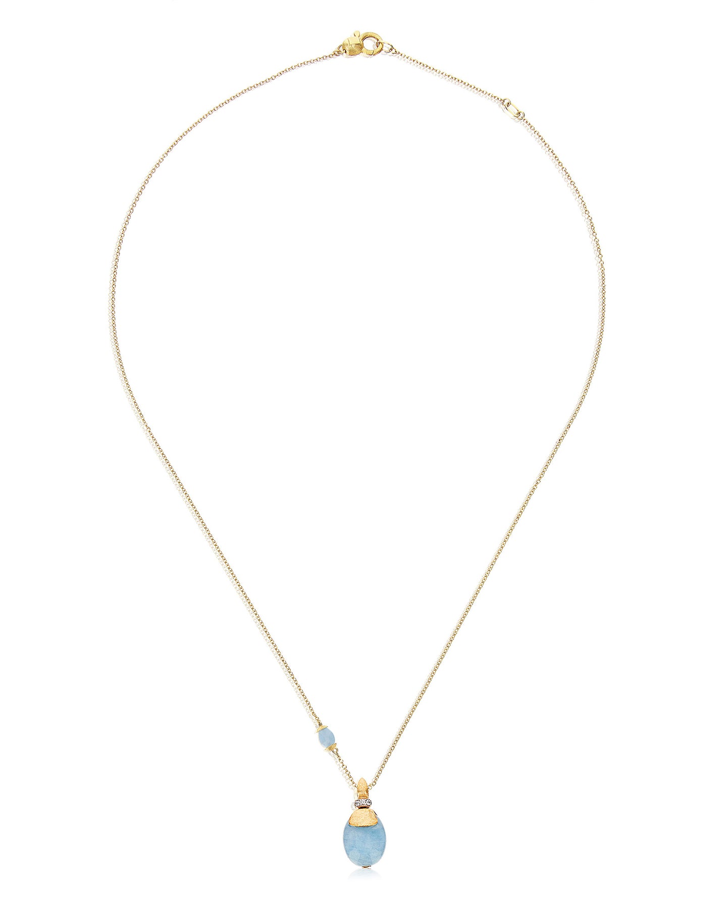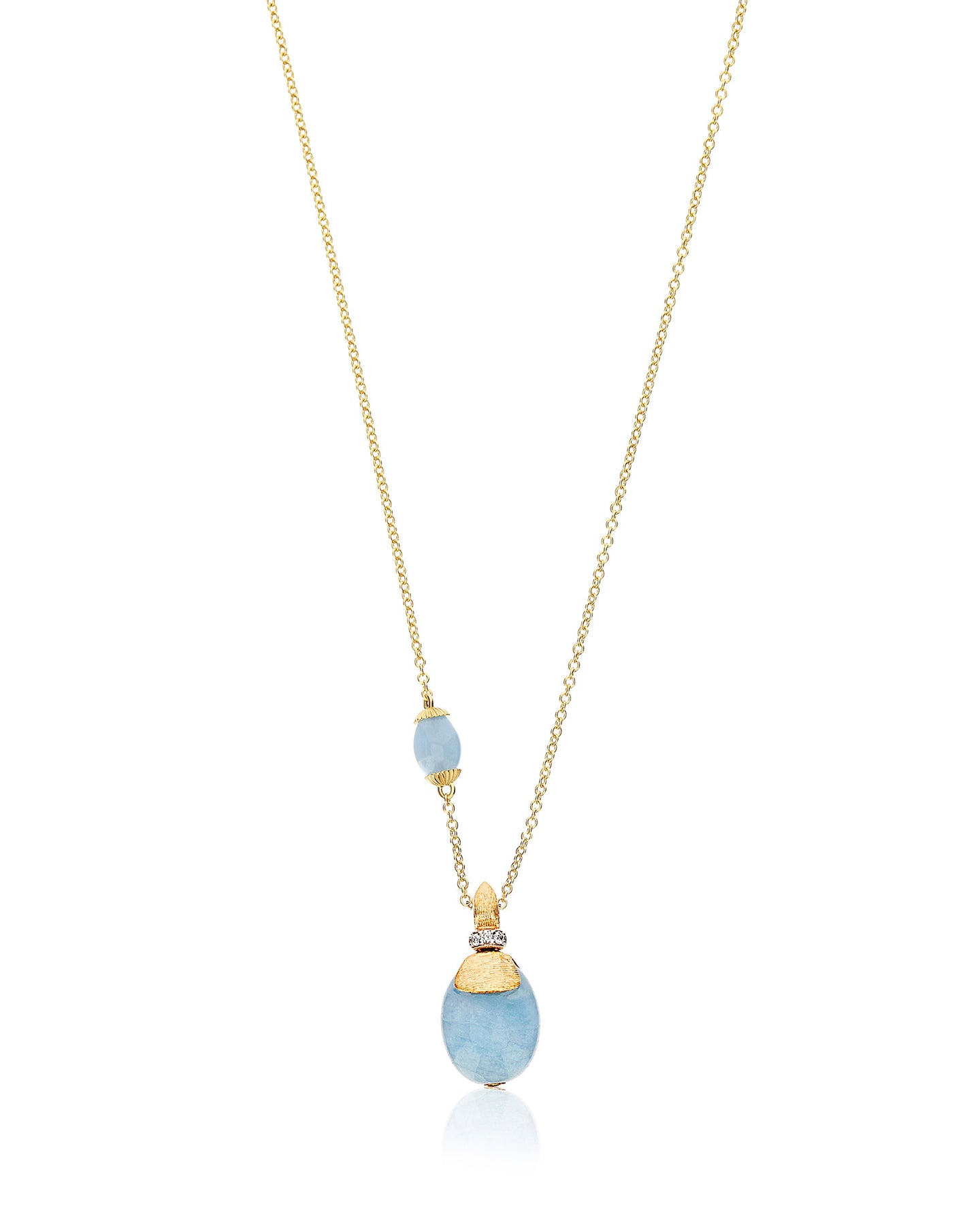 A refined 18kt gold and milky aquamarine pendant crowned with an elegant diamonds detail. The sophisticated gold workmanship plays with light, reflecting it suggestively, and embraces the precious stone like a shell, sealing the encounter between Nature and craftsmanship.