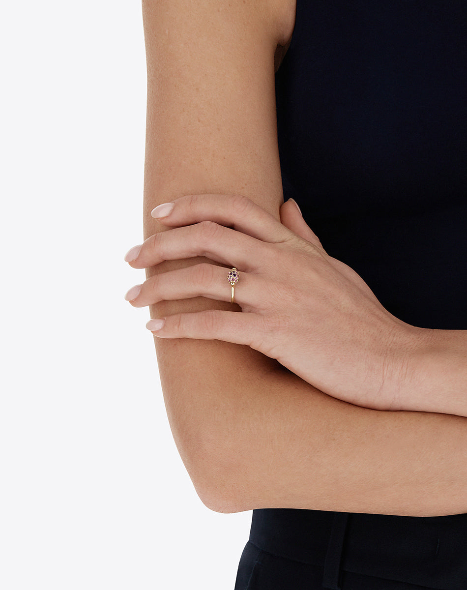 Reverse expertly blends Italian savoir-faire and innovation. At the heart of the collection is a patented mechanism that allows the central element of the piece to be rotated, revealing a completely different side in a simple gesture. A masterpiece of craftsmanship and passion, the “Reverse Baby” ring reinterprets the collection's iconic design in a version featuring delicate dimensions whilst keeping the original character intact. Elegance and versatility combine in a piece of jewelry that alternates a central doublet featuring green labradorite and rock crystal with a pink sapphire, amethyst, green sapphire and tsavorite pavé. An expression of intense and sophisticated style, in a surprising format.
