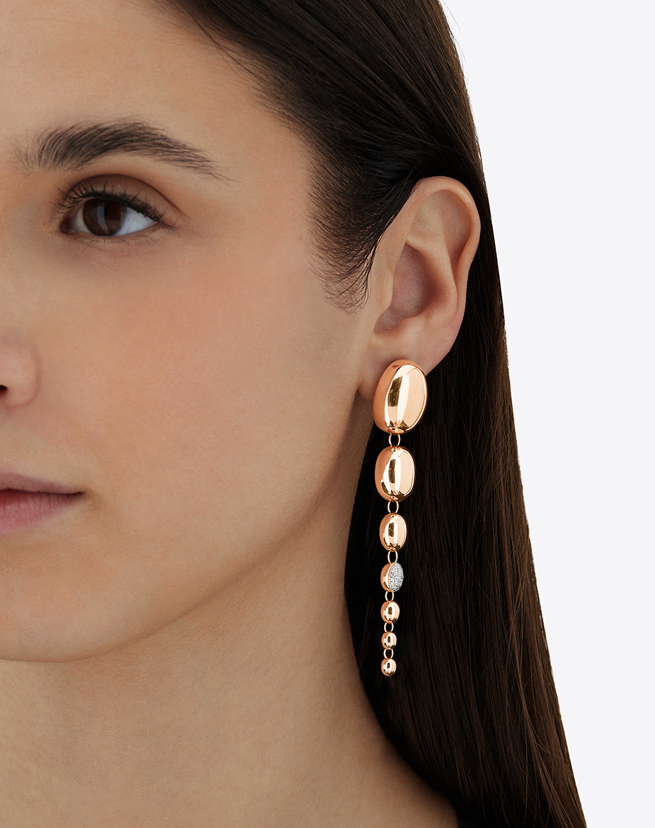 Elegant 18kt rose gold boules chase each other in these contemporary earrings, crowned with a diamonds drop. Laura, who tests each of her creations, has created special butterflies for these earrings, equipped with a little plate to support the upper part of the earring, ensuring a perfect wearability.