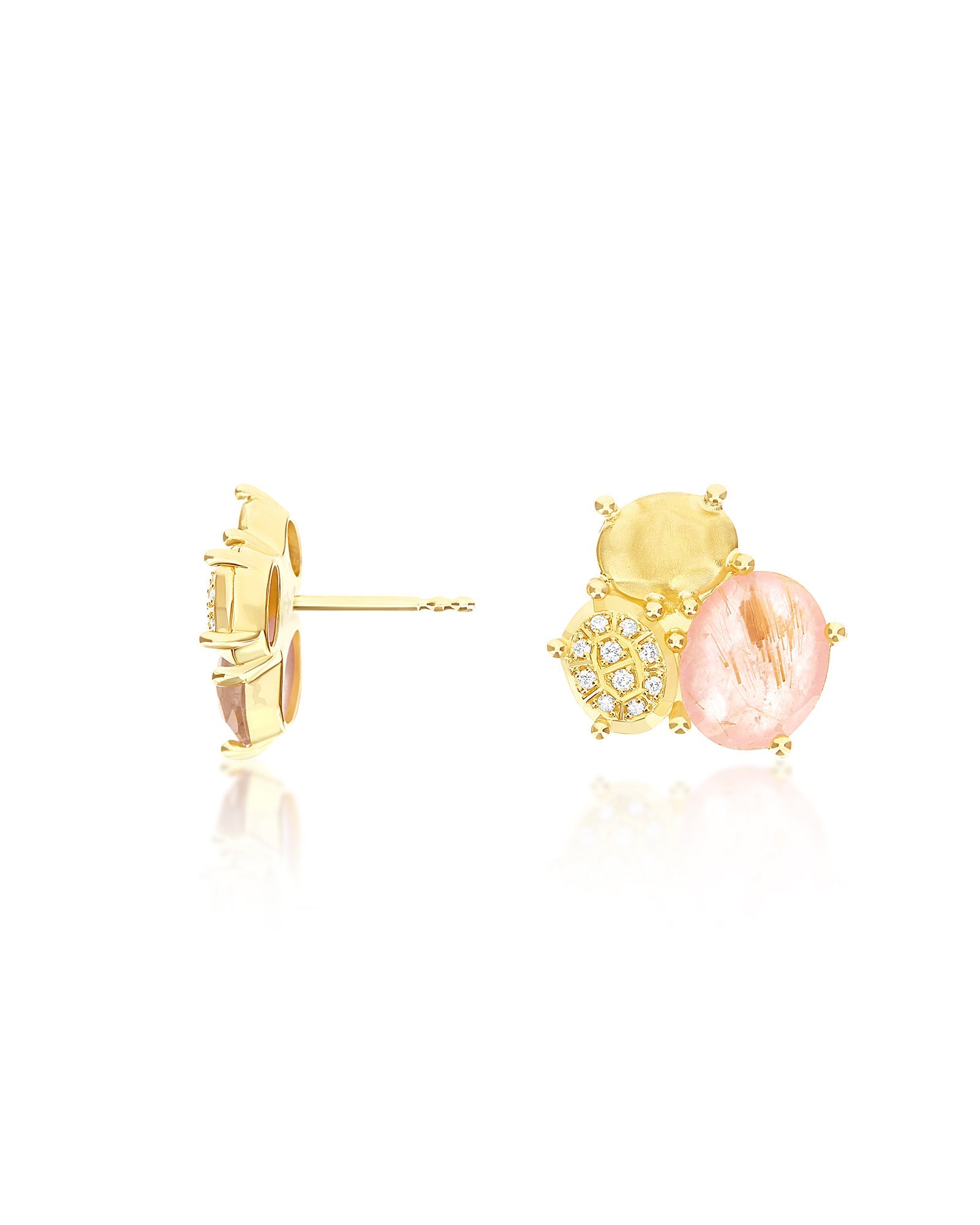 The "Ipanema Sol" earrings are a symphony of light and color, inspired by the beauty of the sun kissing the waters of Ipanema. With rutilated quartz, mother-of-pearl and pink jade, these polished gold earrings boast a timeless elegance that celebrates Brazilian nature.