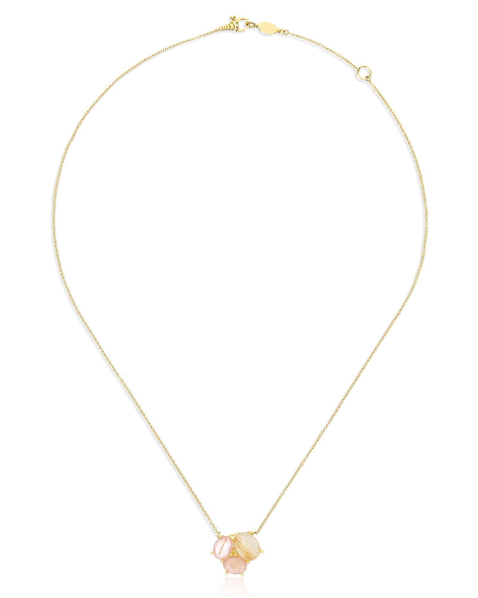 Like a golden sunrise on the beach of Ipanema, this 18K polished gold necklace encapsulates the light and colors of the most intense moments of the day. The trilogy pendant, with triplet of rutilated quartz, mother-of-pearl and pink jade, reflects warm and bright shades, criss-crossed by unique and irregular rutile inclusions. A vibrant, refined jewel which celebrates the magic of tropical skies, with all their light, color and perfect imperfections.