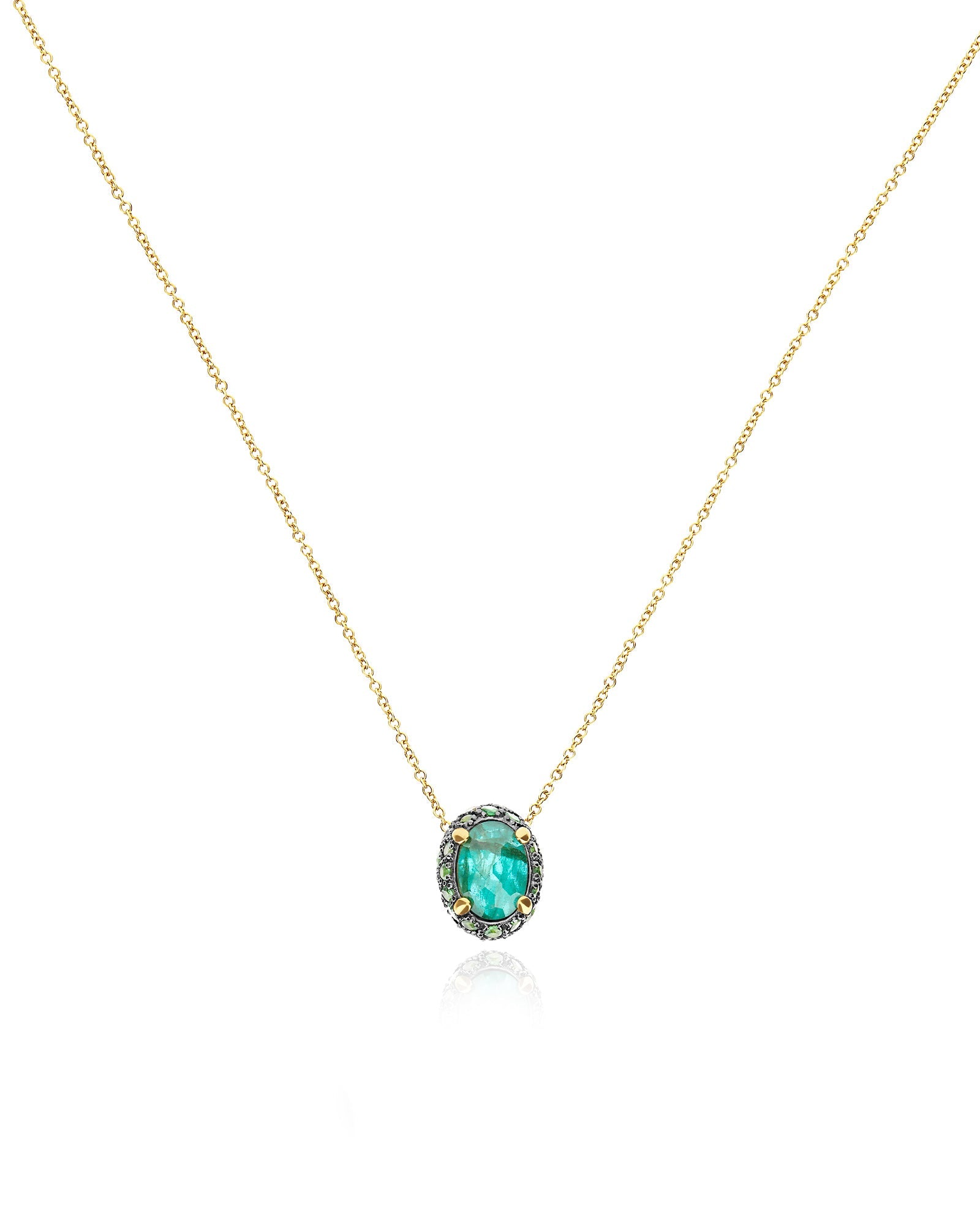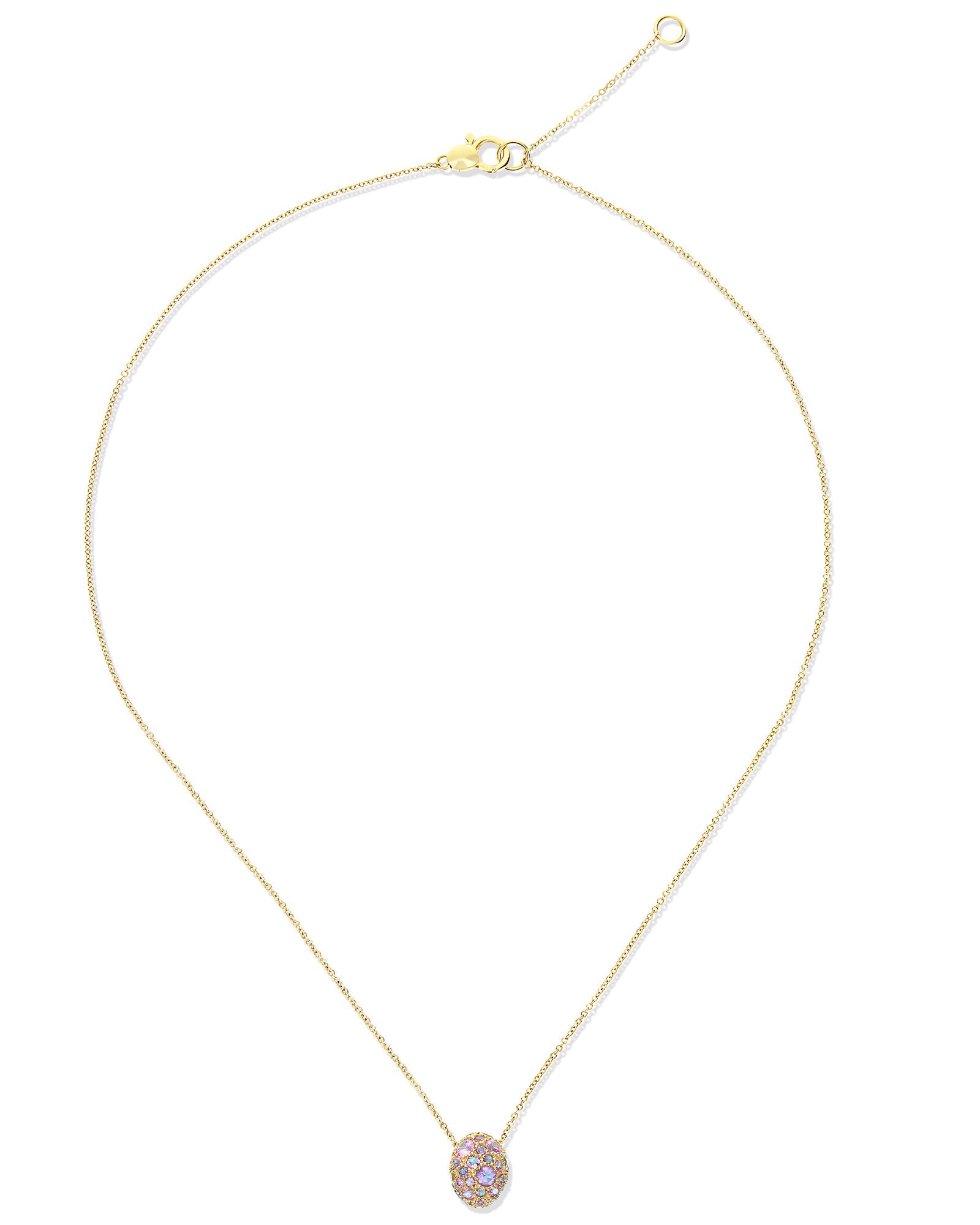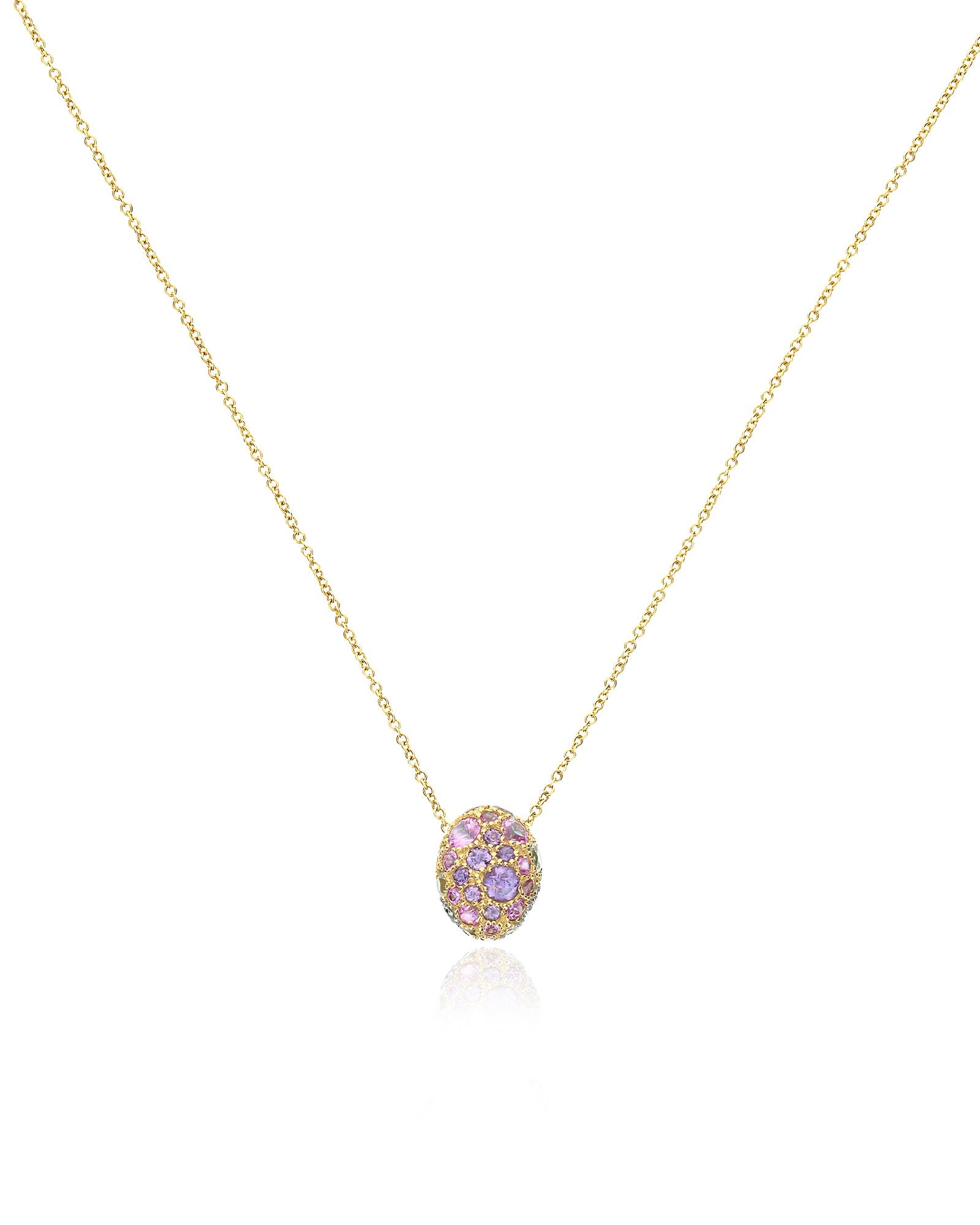 Let yourself be inspired by this elegant and refined double face pendant of the reverse collection. A 18kt gold and diamonds necklace, enriched by beautiful and colorful natural stones, entirely handmade as all is jewels. A true masterpiece in 18kt gold that alternates a central doublette with green labradorite and rocca crystal with a pavè of pink sapphires, amethysts, green sapphires and tsavorites. Our advice? Wear it with its bangle (BS3-584)!