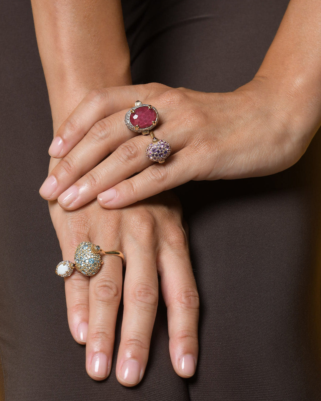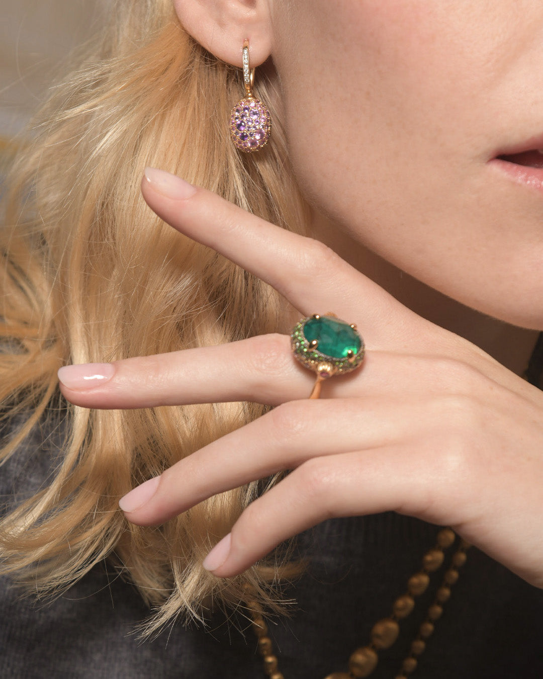 An ode to the elegance of colors and to the versatility, this 18kt gold and natural stones necklace is one of is' signature pieces. The double-faced pendant is designed to sublimate the most diverse looks, finely fastened to a row of "unusal pearls", all of them hand-engraved, which can also be detached and combined to the necklace for a longer version.