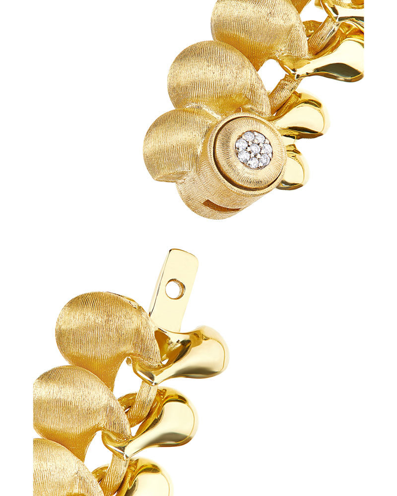 versatility, always in our dna, finds its most accomplished expression and embraces the smartness in this 18kt gold and diamonds collier that with a simple touch, almost by magic, changes its shape, adapting to every occasion. Laura's final touch? The "button" closure, specific for this piece, and which allows you to open and close the necklace easily and by yourself. Trasformista is designed for all women, for mothers and daughters at the same time, and for all those women who wish to classy dress every day.